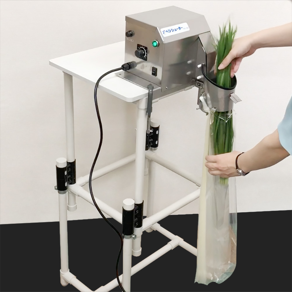 長物野菜(青ねぎ・白ねぎ・ニラ・ごぼう・大根など)や工業部品の袋詰め作業を効率化する機器です。